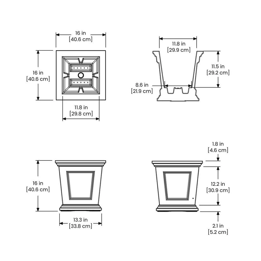 - Weight: 7lbs; Outside Dimensions: 16in L x 16in W x 16in H; Inside Dimensions (w/Tray insert): 11.75in L x 11.75in W x 11.5in D; Capacity: Approximately 4.5 gallon soil capacity and 2.25 gallons water capacity.