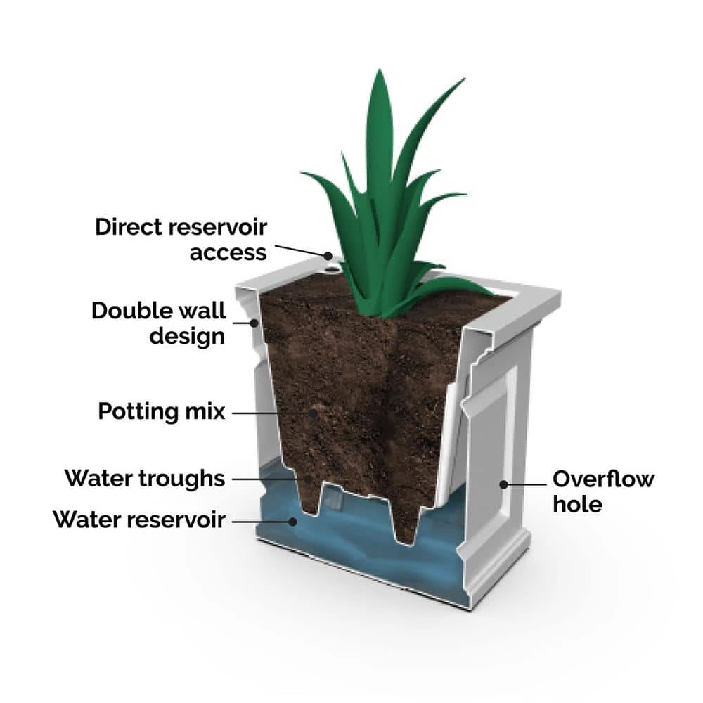 - Features a Water Reservoir: This Nantucket Planter comes with a built-in water reservoir that provides your plants with a consistent source of moisture and allows you to water your plants less often.