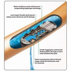 1/2″ Sub-surface Emitter Tubing 50 foot coil for Use below or above ground. Features copper shield technology that naturally protects the emitters from root intrusion without chemicals. This new sub-surface tubing is designed for long-lasting, low-maintenance performance in the garden or landscaping. The tubing has 0.9 GPH emitters spaced every 18 in., and is intended for underground installation. Its direct, subsurface watering of the plant root zone produces faster, healthier growth, higher vegetable yields, and colorful, long lasting floral blooms. Because it leaves no excess water on the leaves as is common with other watering methods, there is less chance of leaf fungus and plant wilt. The tubing is tough and flexible, conforming to most landscaped area shapes without need for extra fittings. Combine up to five 50 ft. coils to extend your watering coverage up to 250 ft.