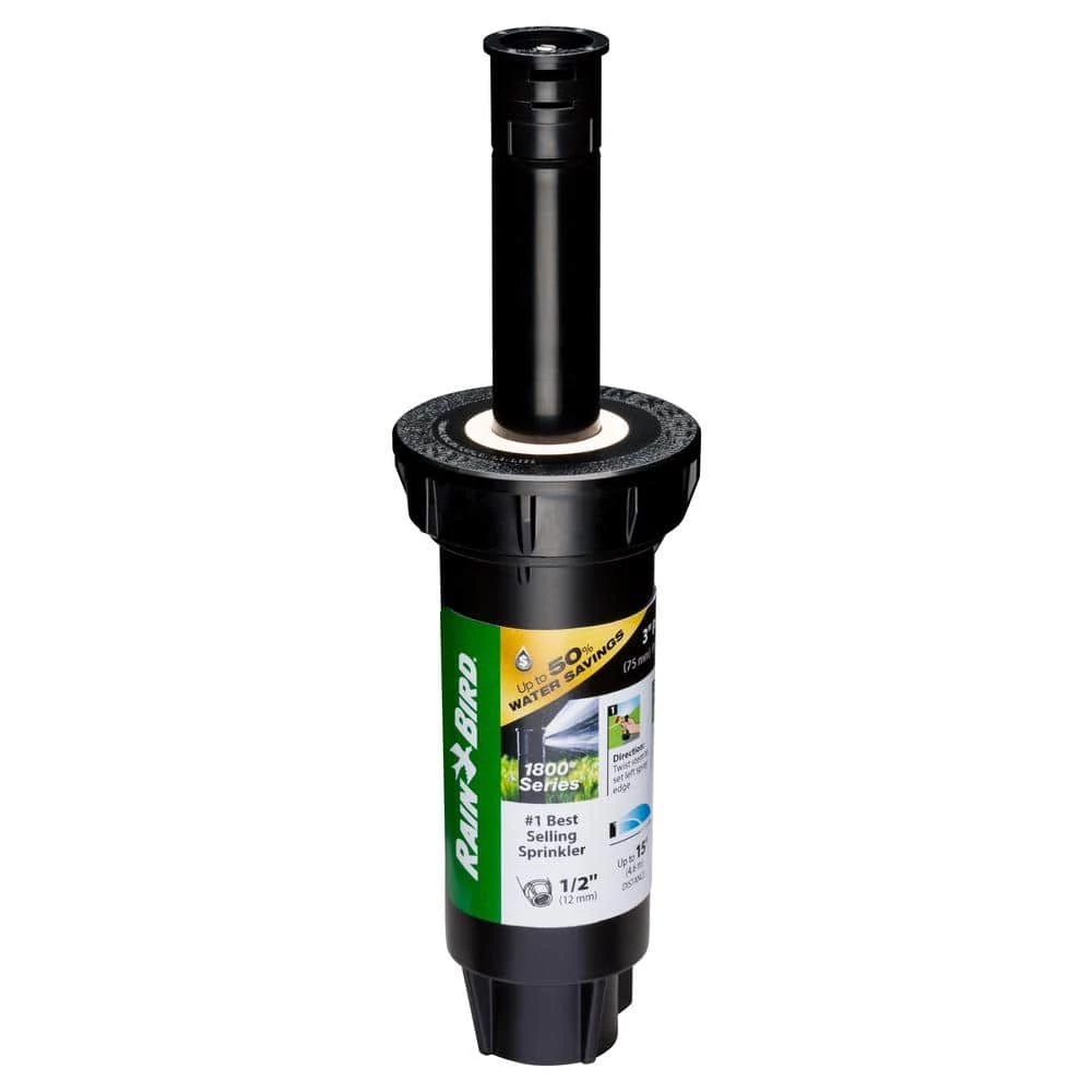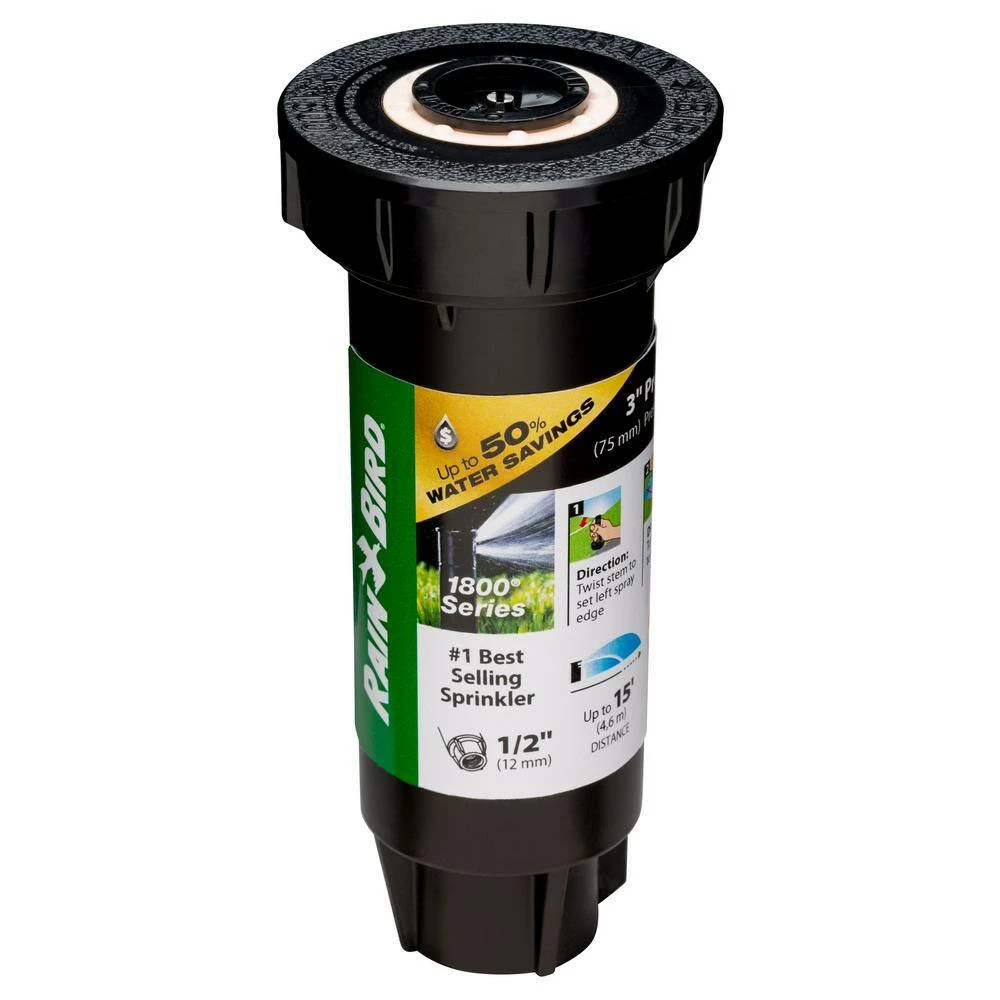 The Rain Bird 1800 Series Professional Pop-Up Sprinkler is the #1 commercial-grade irrigation spray brand in the world. Installed in parks and yards across the globe it is chosen for its reliability, heavy-duty materials and versatility. Precision spray heads and nozzles customize your watering system to cover virtually any configuration of lawn or garden – not the sidewalk or driveway. The 1800 Series has first-rate quality built in for reliable operation and long life. This sprinklers Matched Precipitation Rate allows it to be used in any combination with other Rain Bird fixed and adjustable pattern sprays. A pressure regulator saves water by stopping wasteful misting due to high water pressure. Additional 1800 Series features include a heavy-duty stainless steel spring to assure flush retraction every time. An exclusive co-molded wiper seal provides unmatched resistance to grit, pressure and the environment. A tapered pop-up neck helps to assure retraction in all soil types. A mesh filter screen protects the nozzle from clogging and maintains precise radius adjustment. No tools needed to change nozzles. Operates efficiently at low water pressure; 1/2″ inlet size. Rain Bird ΕThe Intelligent Use of Water”