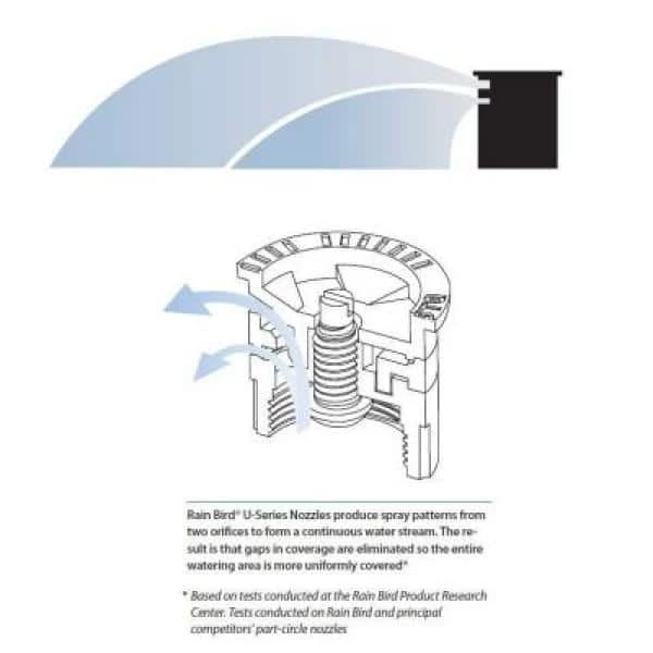 - 360° fixed pattern Dual Spray nozzle helps prevent dry spots at the base of the sprinkler