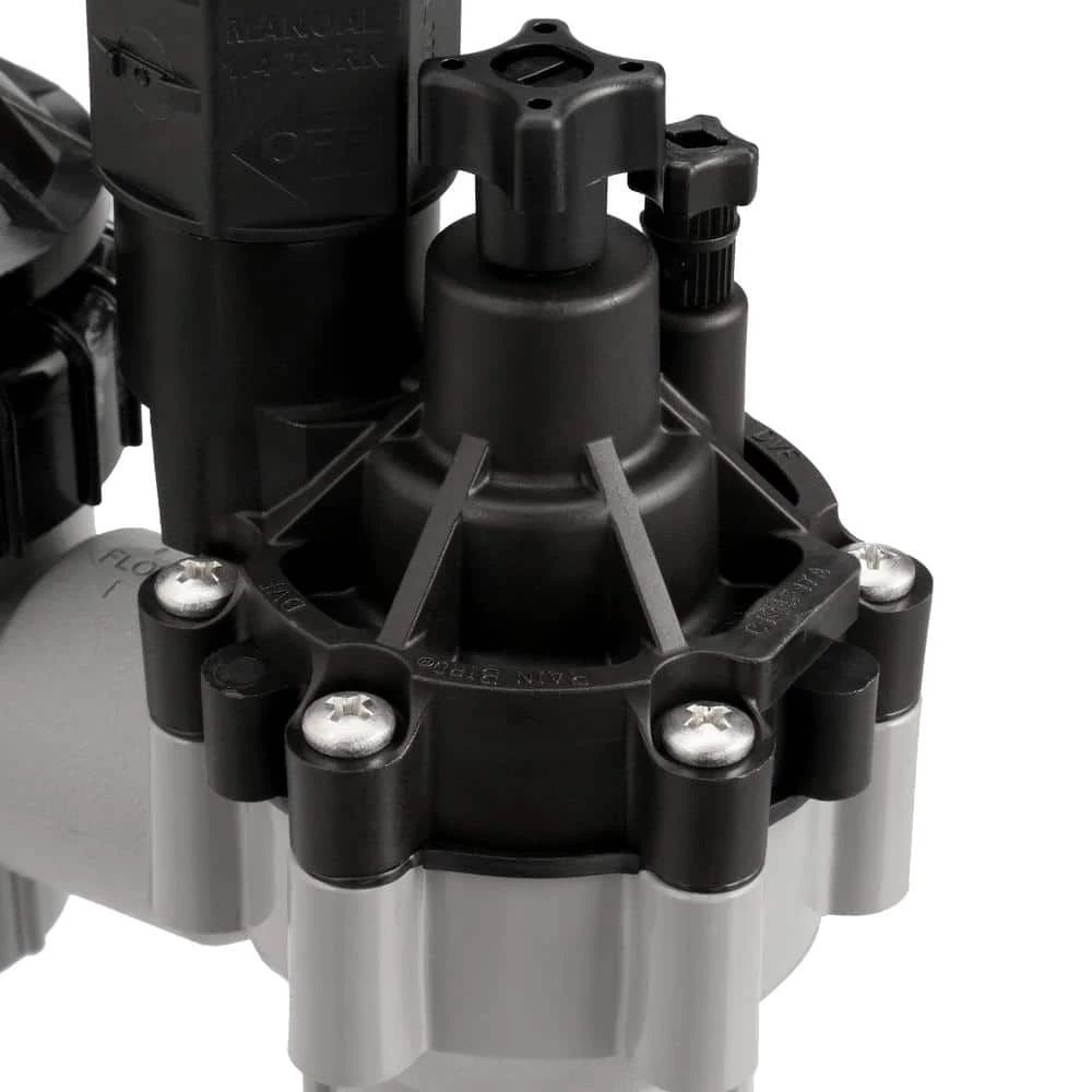 This professional grade anti-siphon valve replaces Rain Bird and other irrigation valves installed above ground with 3/4 in. female threaded inlet and outlet. It can be used with any 24 Volt AC irrigation timer. Its unique reverse-flow design helps prevent flooding in the event of internal diaphragm failure, keeping the valve closed and saving water. Anti-Siphon valves should always be installed at least 6 in. above the highest head on the valve line, and should never have another valve installed further down the line from the main valve. After installation and before startup, always the flush system of dirt and debris manually using the valve’s external bleed screw. Equipped with the additional advantage of adjustable flow control, this model helps prevent wasteful misting when water pressure is too high. A top mounted, easy turn flow control knob allows you to optimize flow to the zone, permitting sprinklers to water at their most efficient rate for more uniform coverage. This valve can be applied with all types of watering devices including Rain Bird spray heads (1800, 600), and rotors (22SA, 32SA, 42SA+, 52SA, LG3 and AG5) as well as Drip zones when properly installed together with a pressure regulator and filter.