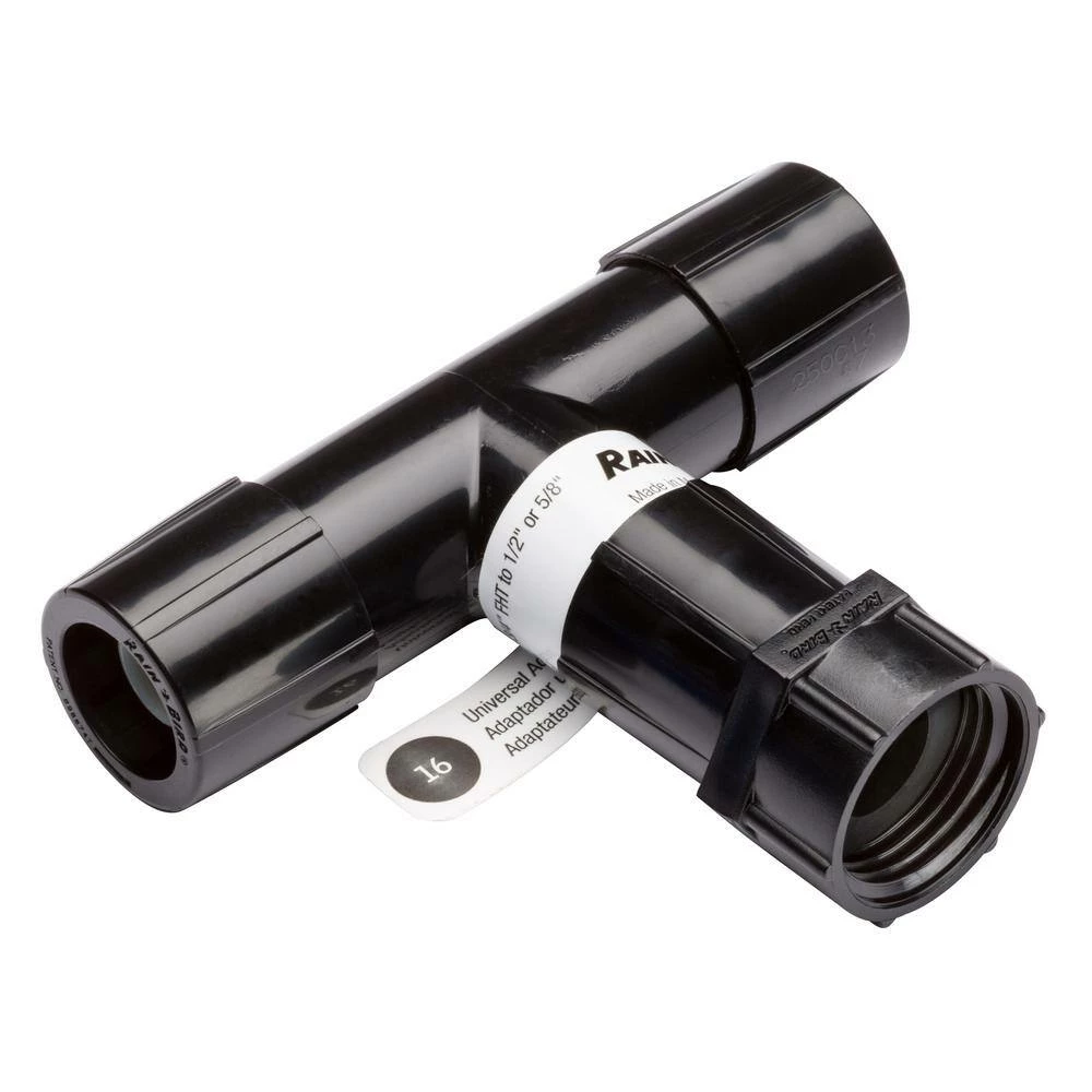 Rain Bird EFTFHT-1S Drip Irrigation Easy Fit Tee Adapter, 3/4 in. Female Hose Thread x Easy Fit Universal Fitting, Fits All 1/2 in. and 5/8 in. Drip Tubing. This adapter connects 1/2 in. Drip tubing to either a 3/4 in. hose bib or garden hose in a T configuration allowing Drip tubing to run in 2-separate directions. The 3/4 in. female thread hand tightens to your water source while the 2-compression fittings quickly connect to 1/2 in. or 5/8 in. Drip tubing. Rain Bird’s Easy Fit system involves simple push-together hand assembly and fits all brands of 1/2 in. and 5/8 in. Drip tubing. Quick, push-together assembly speeds installation. The finished connection is durable, leak-resistant and stays in place season after season. Constructed of highly durable UV and chemical-resistant materials to assure long life. Recommended operating pressure: 0 to 60 psi. Rain Bird The Intelligent Use of Water.
