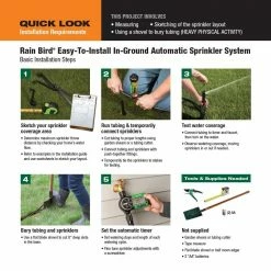 If you are tired of hassling with hose and sprinklers, and getting poor results from manual watering, this new automatic system is a perfect solution. The first professional grade Rain Bird sprinkler system designed for homeowner installation, it provides everything you need to keep your lawn green season after season while saving water. The system attaches to any outside faucet and includes six high-efficiency rotary sprinklers with patented Rain Curtain nozzle technology. The same sprinklers used in professionally installed systems worldwide, these rugged sprinklers deliver a rotating curtain of water with large droplets that fall quickly to avoid windblown overspray and to cover evenly from head to perimeter for reduced overall watering time. Simple adjustments for spray rotation and distance help you keep the water on your lawn and off the house, sidewalk and driveway. Controlling the sprinklers is Rain Bird’s heavy duty timer with large readout screen and simple scroll settings for automatic watering any days of the week and up to two times per day. Flexible scheduling allows customizing your settings for specific needs such as watering of slopes where two short cycles will allow the water to soak in better, avoiding runoff waste. The timer also features manual buttons for “Water Now” and “Cancel” watering without affecting the program. An illustrated manual shows the 5-step installation process as well as example sprinkler placements for different lawn areas.