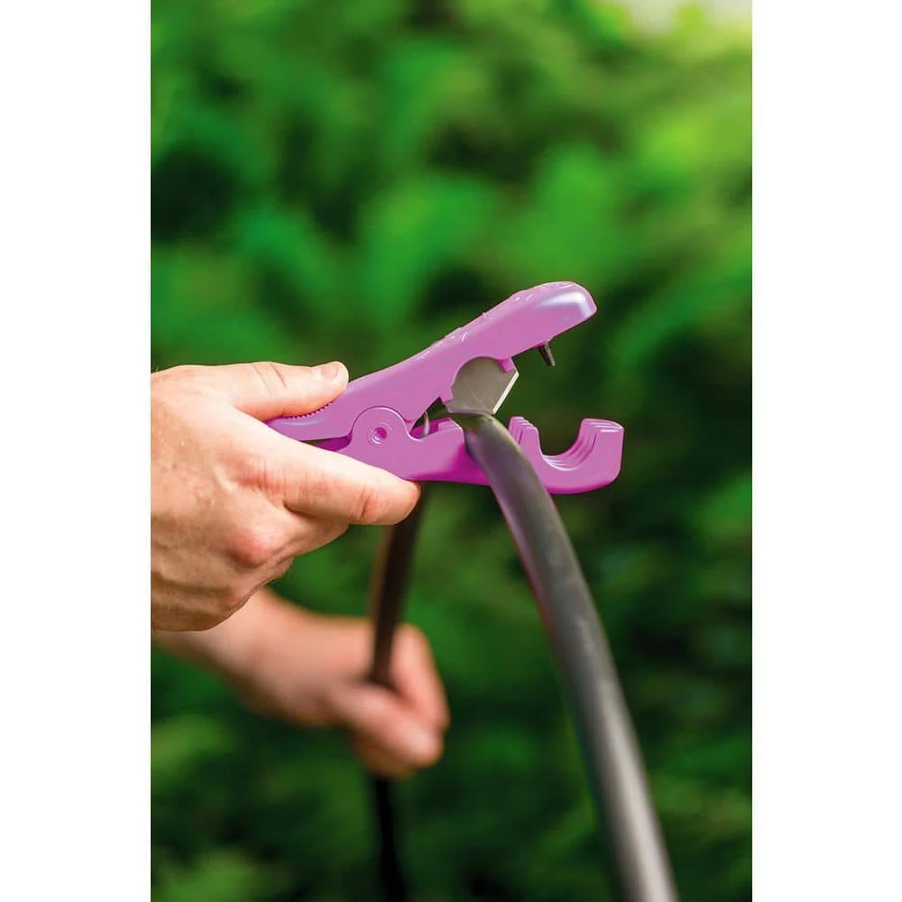 Rain Bird HPTCX Drip Irrigation 2-in-1 Combination Tubing Cutter/Hole Punch Tool. This time-saving, 2-in-1 combination tool cuts and punches holes in Drip irrigation tubing. Spring-loaded design with comfortable ergonomic grip and stainless steel blade. Angled 2-sided blade aligns tubing for a clean, square cut resulting in no jagged edges or crushing of tubing. Spring-loaded design will automatically close jaws after cut or punch for safety and field-storage convenience. Hole punch pierces a clean hole and leaves tubing free of debris. Perfect for piercing holes in 1/2 in. or larger Drip tubing for installation of: drippers/emitters, sprays/misters/bubblers/riser devices, and 1/4 in. tubing fittings. Highly visible purple color allows tool to be easily seen in grass, soil, bark etc. Rain Bird The Intelligent Use of Water.
