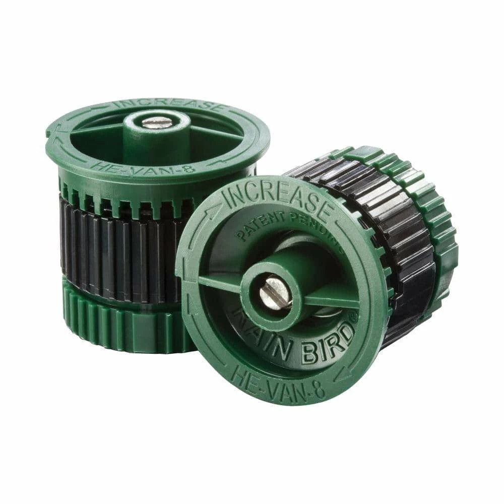 Building on Rain Birds legacy of high efficiency irrigation nozzles, the HE-VAN series combines water saving performance with the convenience and versatility of variable arc nozzles. Up to 30% more efficient than other adjustable nozzles, HE-VAN nozzles can help you save water in any pop-up spray zone, correcting for uneven coverage and helping to reduce watering run times. They can replace the nozzles on most major brands of spray heads. Their superior flow control technology delivers more uniform spray coverage across the pattern, even close to the head. Producing larger droplets that fall quickly and resist wind-blown overspray, HE-VAN nozzles also help you keep water on the grass, not on the sidewalk, driveway or buildings. With a simple twist of the nozzle collar you can adjust the spray pattern from 0 degree to 360 degree s. Spray distance is adjusted by a top screw, allowing you to reduce nozzle throw up to 25%. All feature Rain Birds MPR (matched precipitation rate) watering distribution allowing them to be mixed with other MPR spray heads on the same zone regardless of spray adjustment.