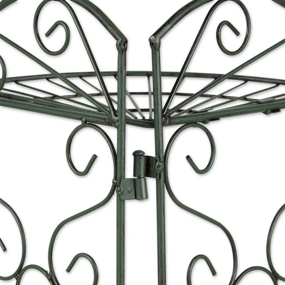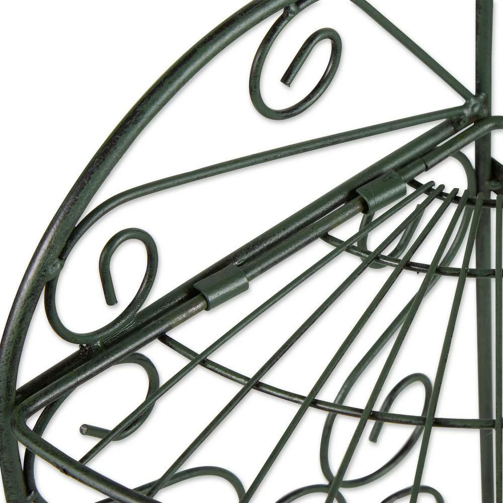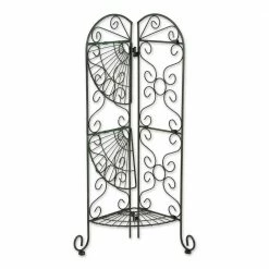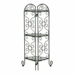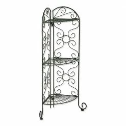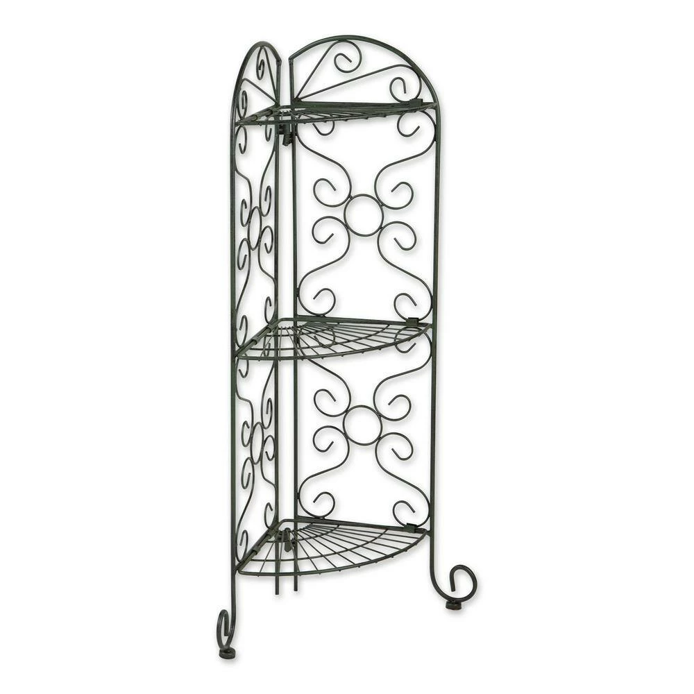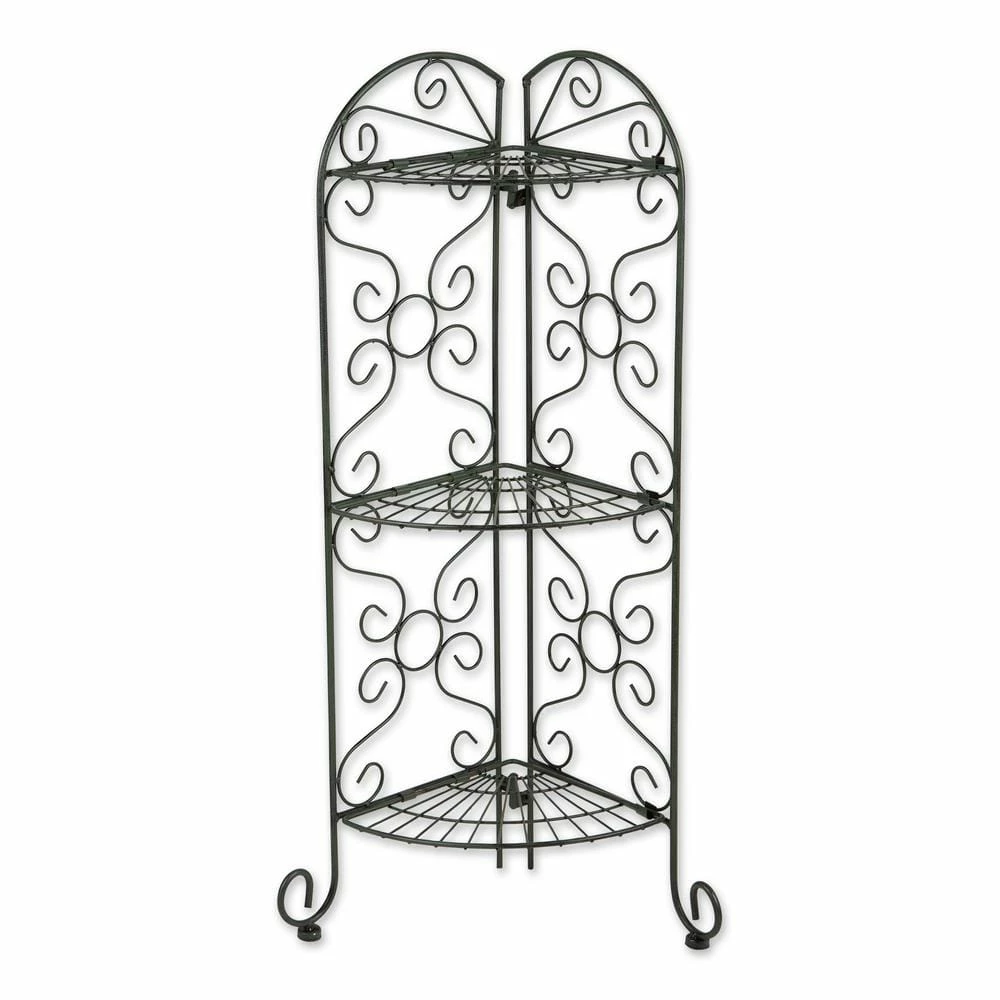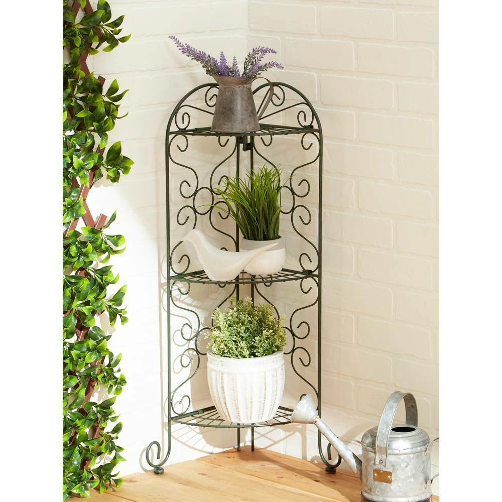 - Antiqued faux-verdigris plant stand is designed to fit into any corner; 3-shelves provide ample room for plants or display items