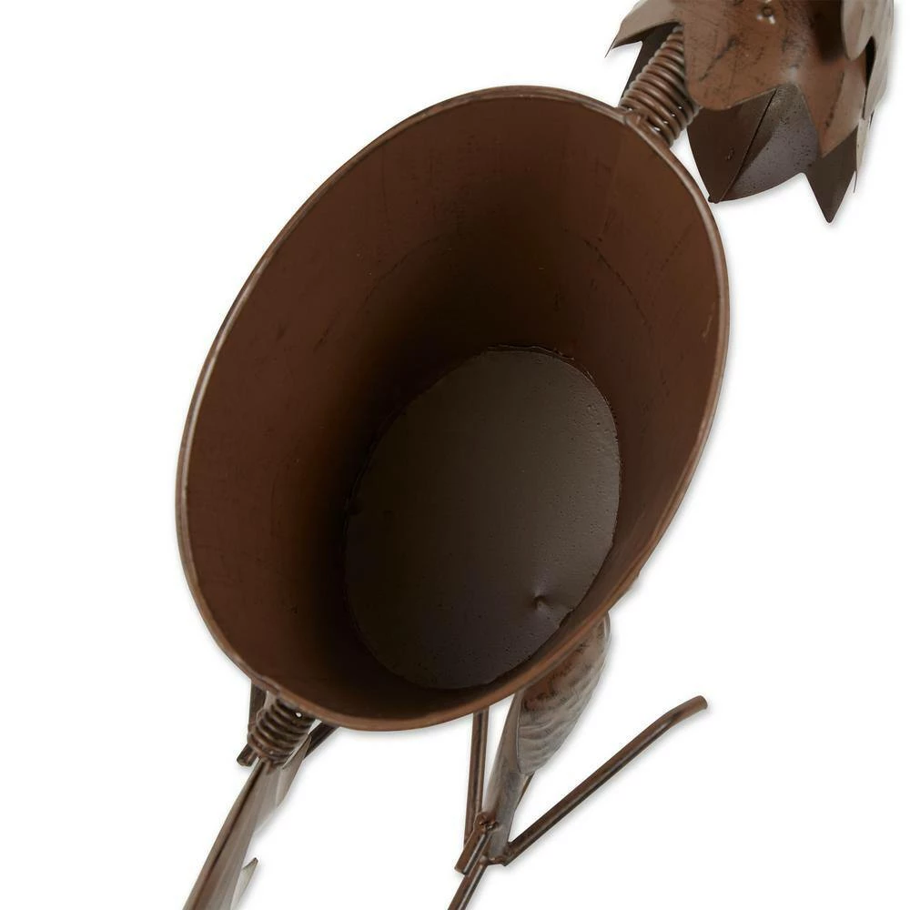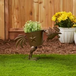 - Pecking rooster is made from iron with a weathered brown finish and the planter itself features a lone star, a beautiful complement to your garden greenery, this iron planter will add a classic country look to your decor