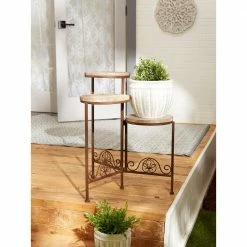 - Weathered wood and rustic finish lend a timeless look to this handsome planter stand, folding configuration and 3 graduated pedestals let you arrange your favorite greenery for maximum style impact