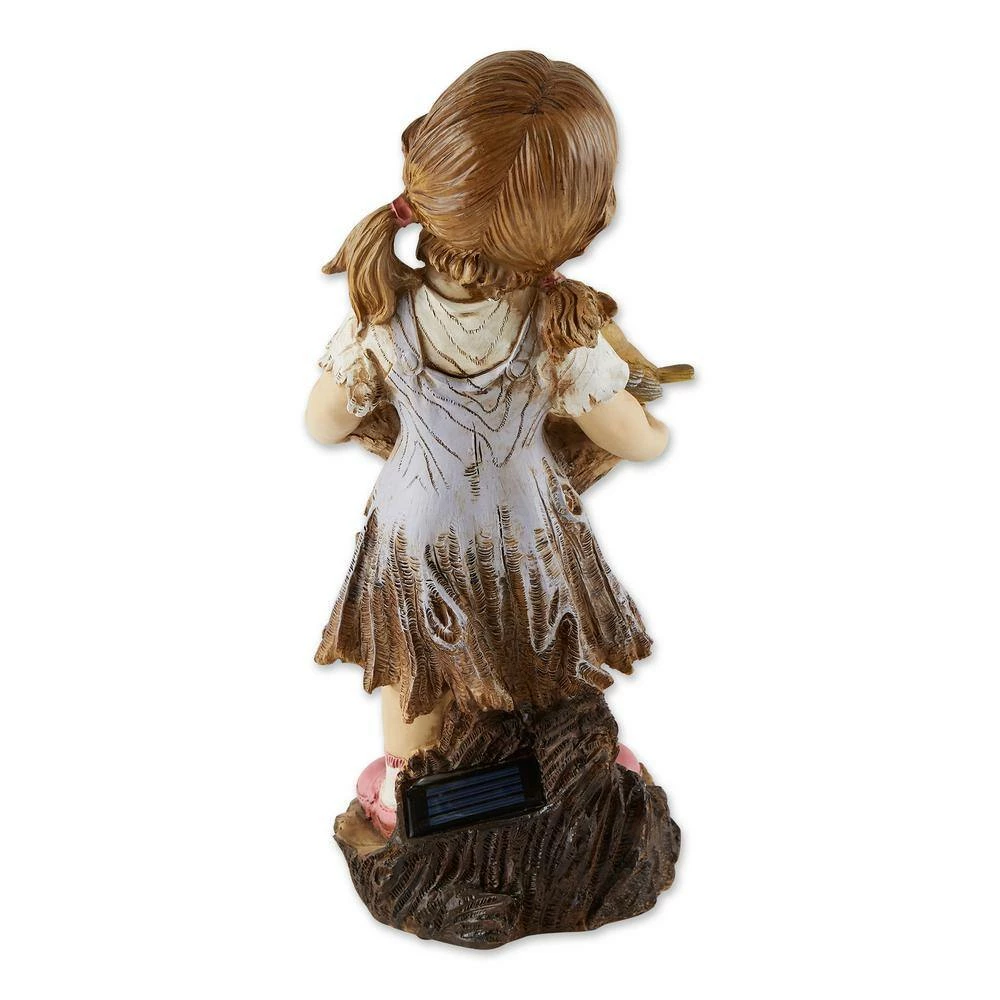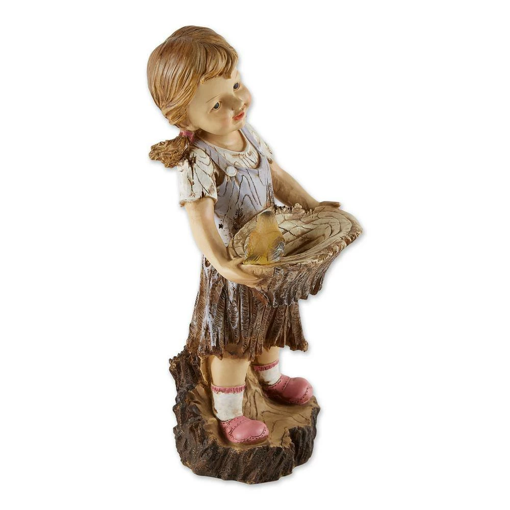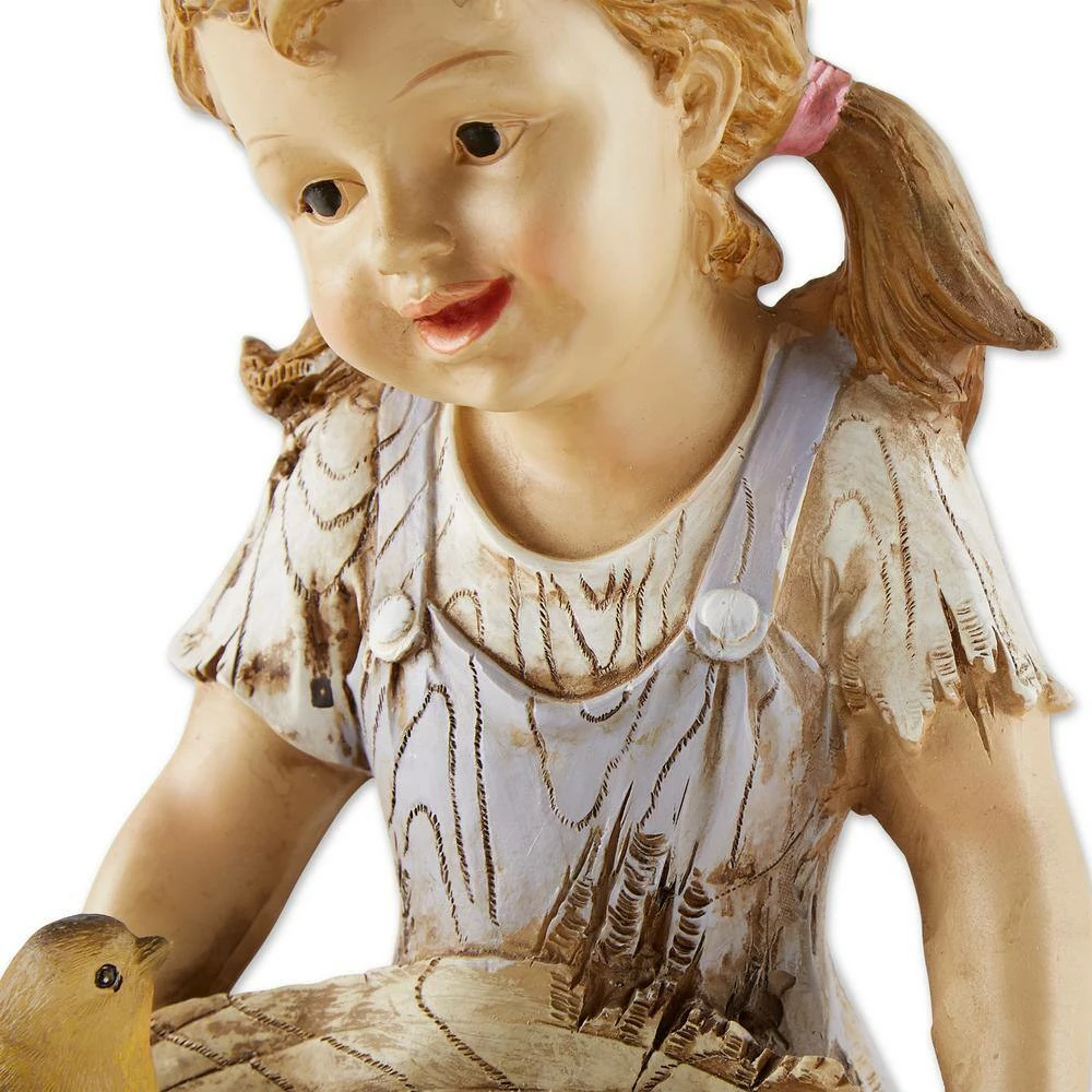 - Rosy-cheeked girl and her friendly feathered companion get ready to gather a summer bouquet, lovingly fashioned to resemble hand carved wood, a special hidden solar light provides a lovely after-dark glow, this adorable solar statue is a great addition to your front walk, garden, or patio