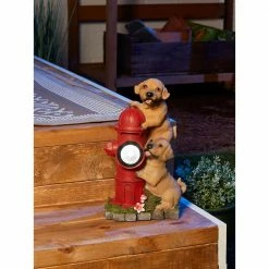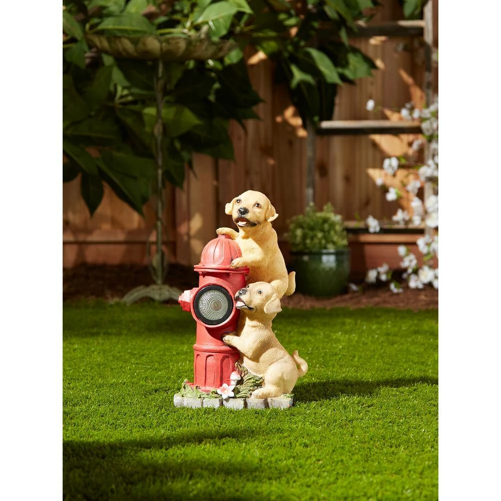 - Liven up your outdoor space with this adorable puppy solar light statue featuring 2 cute pups climbing on a fire hydrant, this adorable solar statue is a great addition to your front walk, garden, or patio